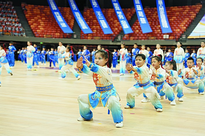 7月24日,山东省第十六届中学生运动会开幕式在青岛市民健身中心体育馆举行。来自16市的运动员代表及青岛市41所中小学校近5000名师生通过运动员入场风采展示、特色文体展演等形式,集中展现了全省学校体育工作成果和学生积极向上的青春风采。图①为开幕式全景。图②为武术表演。