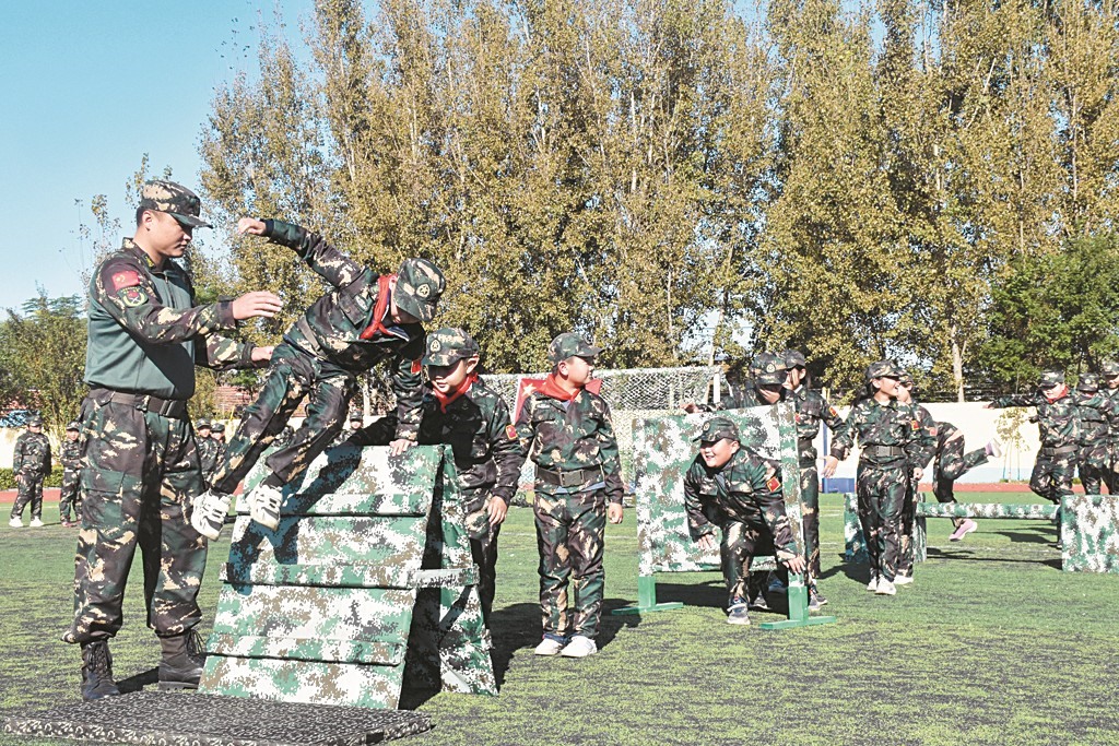 主题教育活动。学生通过队列训练、低姿匍匐、越障等军事体验项目,亲身感受军旅生活,增强国防安全意识。(孙传波 摄影报道)