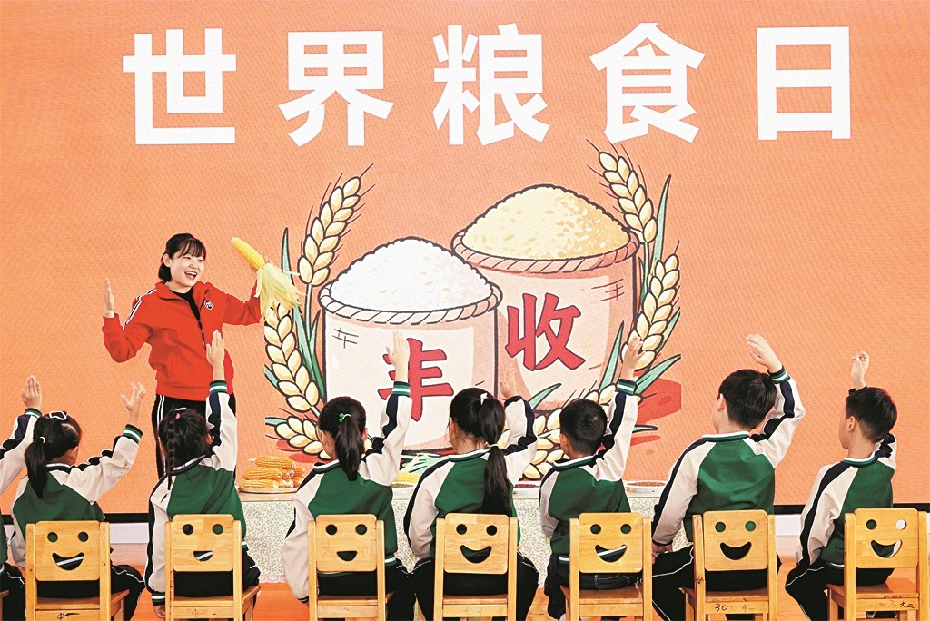 个世界粮食日,当天,枣庄市市中区文化路丝雨幼儿园开展了主题教育活动,增强幼儿爱惜粮食、节约粮食的意识。图为该园教师正在教育幼儿珍惜粮食。