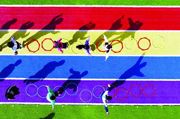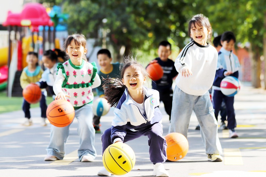 近日,高密市金苹果幼儿园开展了阳光大课间活动。图为幼儿在体育运动和趣味游戏中锻炼身体。