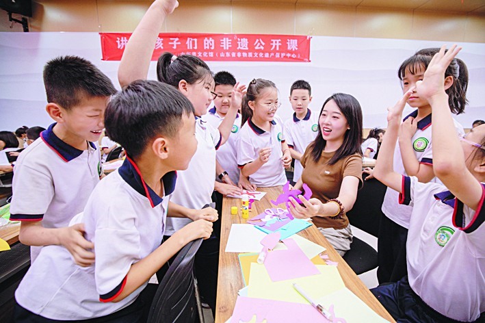 在淄博市淄川区商城路小学举办的“讲给孩子们的非遗公开课”活动中,杨杨走进学校,为学生们带来了一场精彩的剪纸艺术盛宴。 胡吉海/摄
