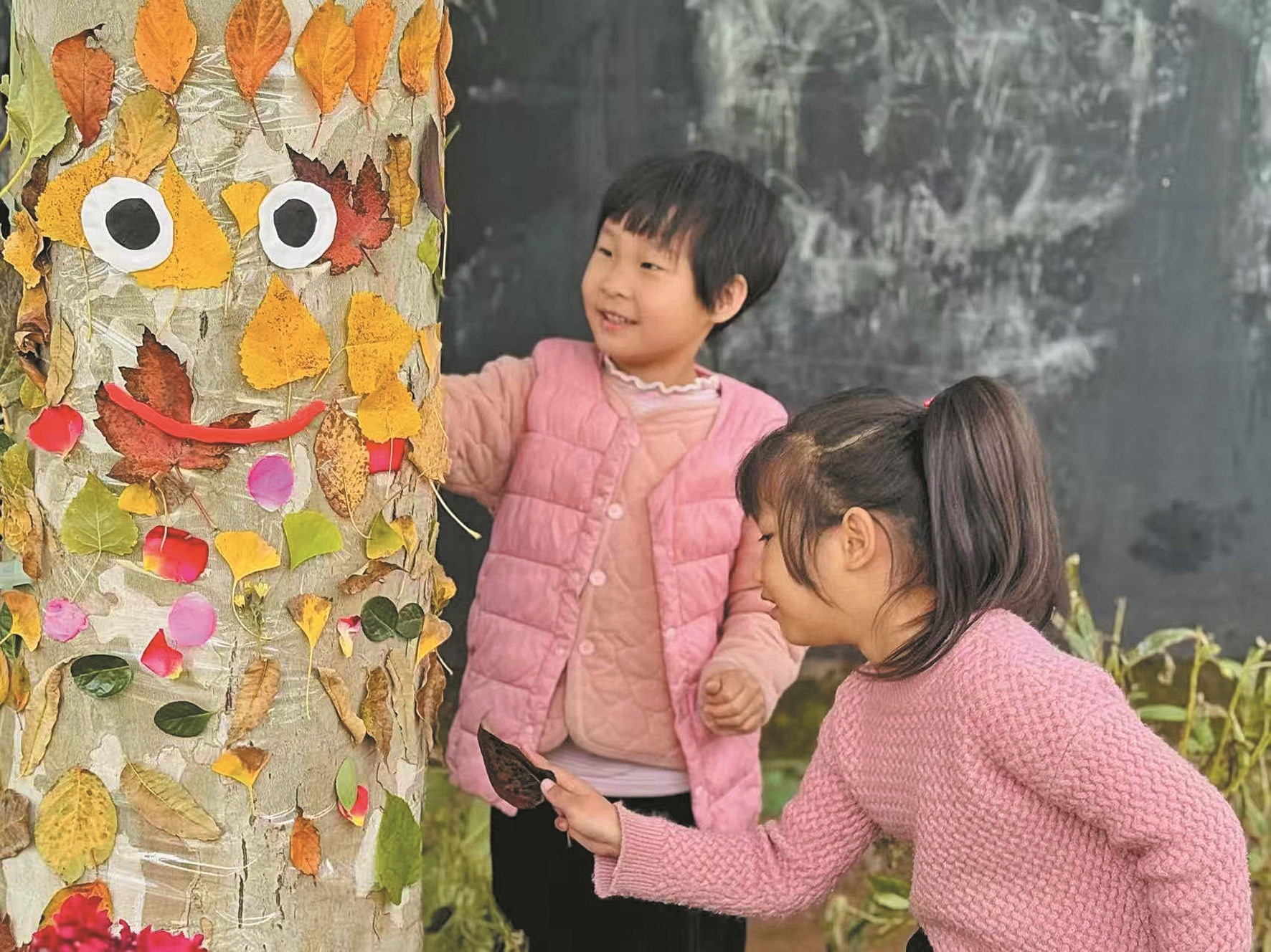 “为大树添冬衣”主题活动。在活动中,幼儿捡拾落叶、点缀树干,为大树“穿冬衣”,直观感知立冬节气的特点。(李育霖 摄影报道)