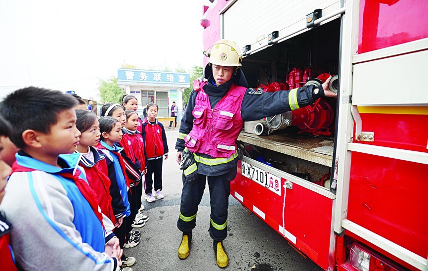 图②为沂南县铜井镇鲁家庄中心小学邀请县消防救援大队的消防救援人员为学生讲解消防安全知识。(王彦冰 摄影报道)