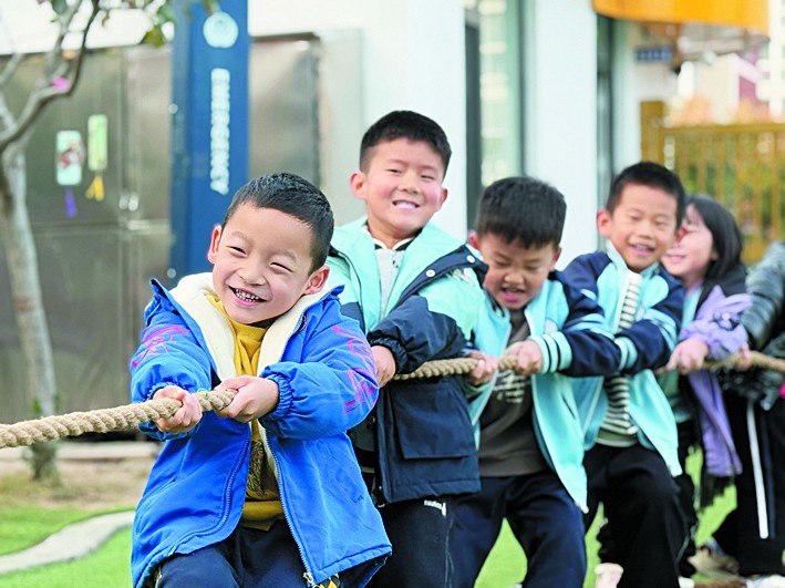 小胳膊,大力量!近日,五莲县洪凝街道中心幼儿园举行了一场充满活力的趣味拔河赛,旨在培养幼儿热爱运动的精神,提升幼儿的身体素质。(毕晓娜)