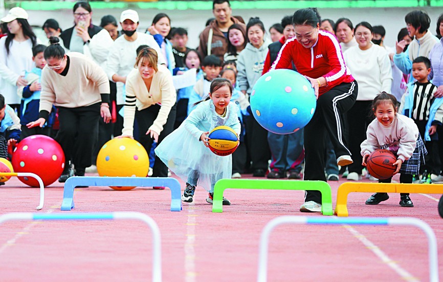 日前,滕州市西岗镇中心幼儿园柴里分园举办亲子趣味运动会,幼儿尽享运动带来的乐趣和亲情陪伴的幸福时光。(李志军)