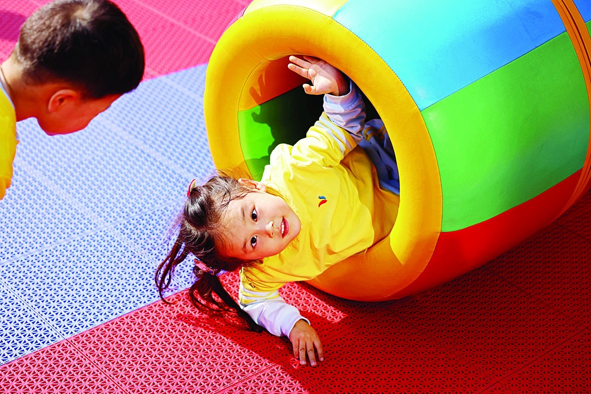 近日,枣庄市市中区红黄蓝幼儿园组织开展了丰富多彩的户外活动,引导幼儿在快乐的奔跑与探索中激发对世界的好奇心,培养勇于尝试的探索精神。图为幼儿在玩“滚筒”游戏。(孙中喆)