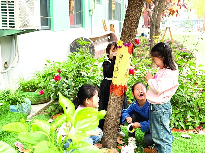 近日,秋日的阳光洒在莘县实验幼儿园的小院子里,幼儿捧着捡来的各色树叶围在大树旁,小手忙忙碌碌。原本褪去盛装的大树在幼儿的装扮下披上了新装,点点滴滴都藏着幼儿对秋天的喜爱。