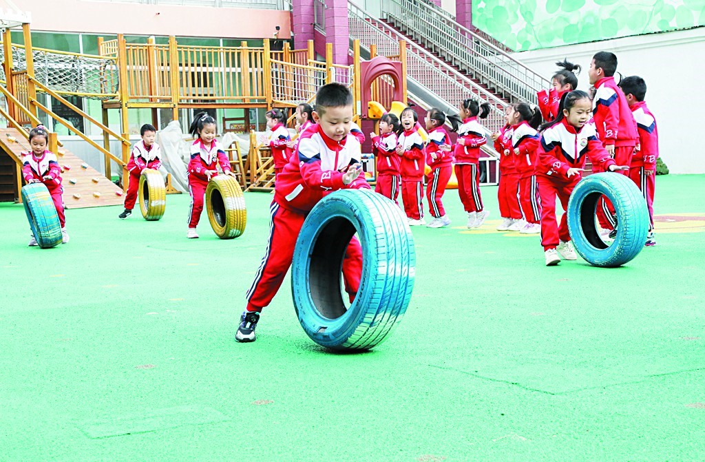 近日,在博兴县实验小学附属幼儿园组织的“滚轮胎”趣味比赛中,幼儿既享受了运动的乐趣,又树立了勤俭节约的意识。(陈彬)