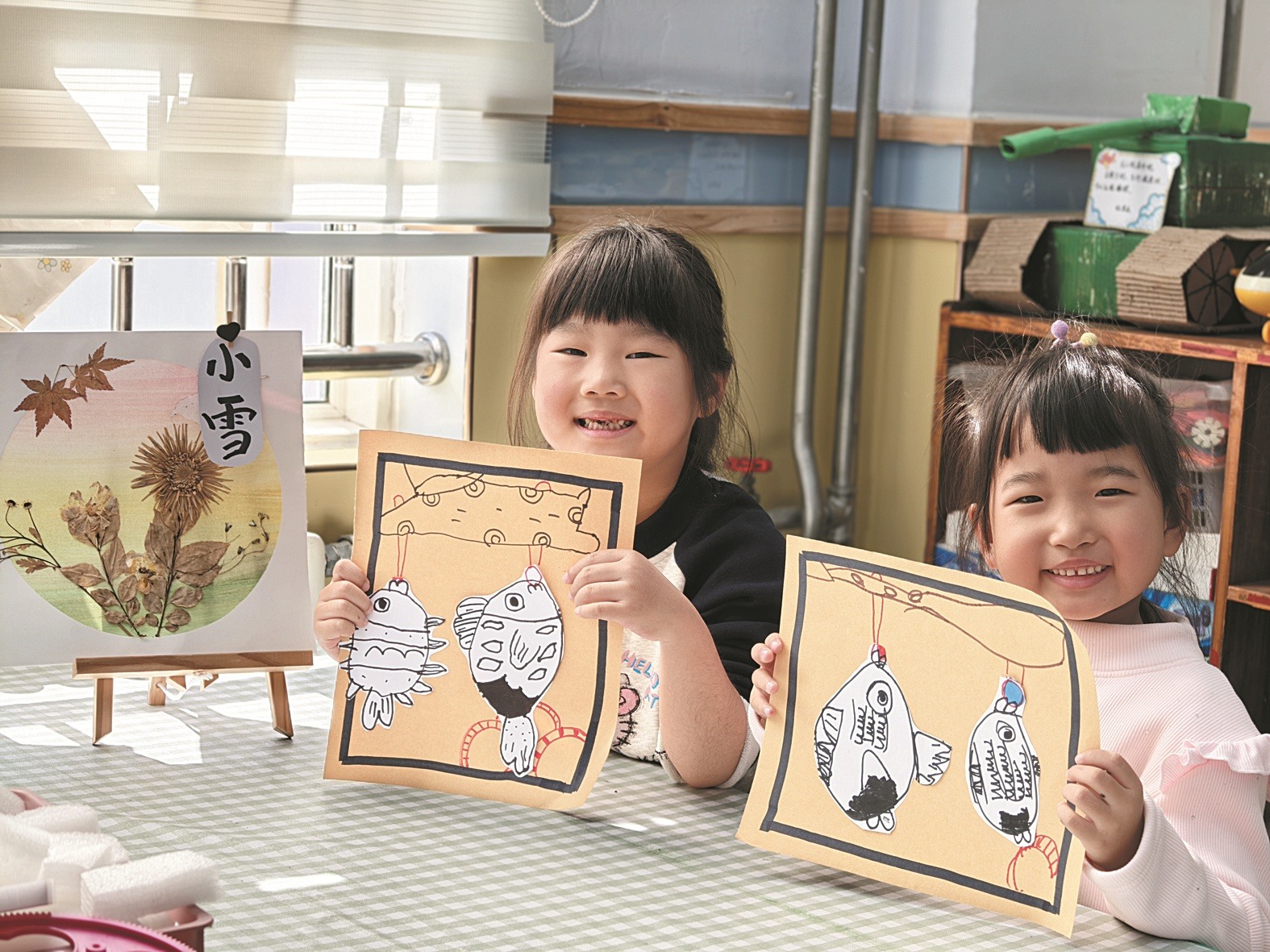 近日,五莲县洪凝街道中心幼儿园在中华优秀传统文化传承活动中融入艺术启蒙,开展了一场“小雪晒鱼趣”主题绘画活动。幼儿轻握画笔,将小雪时节的暖阳、挂架上的鱼干、窗边的童趣融入画纸,感受线条勾勒的鲜活与画面构图的巧思。(毕晓娜)