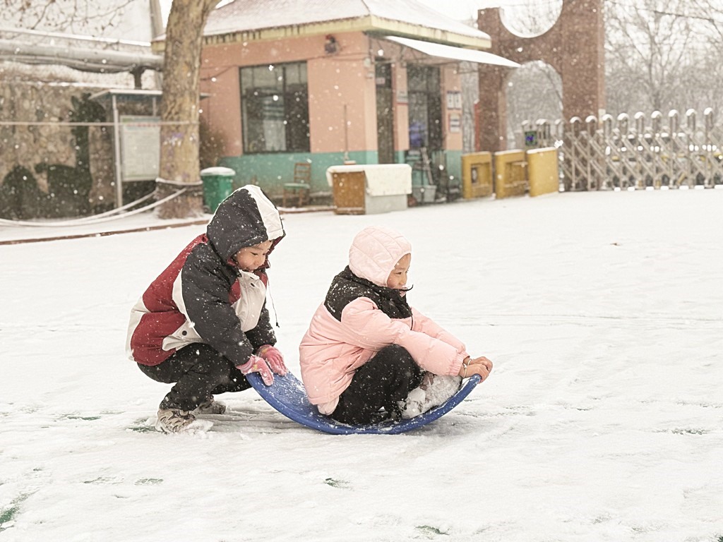 “嬉雪”活动。图为两名幼儿正在雪地里玩耍。
