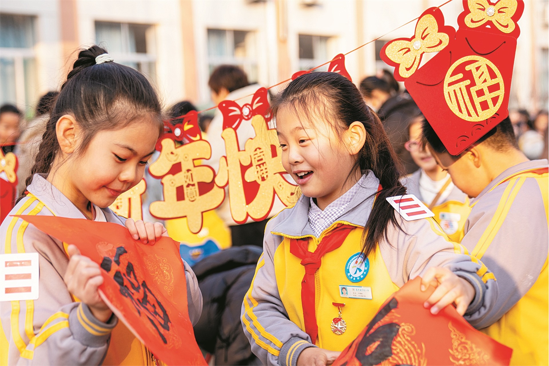 近日,高青县实验小学举办“马跃新程、年味满园”庆元旦主题活动。活动融合节气知识、劳动教育、传统文化与科技课程,设置了非遗文化展示、沿黄乡村美食制作、手工民俗体验等板块。图为两名学生在活动现场挑选春联。(张维堂)
