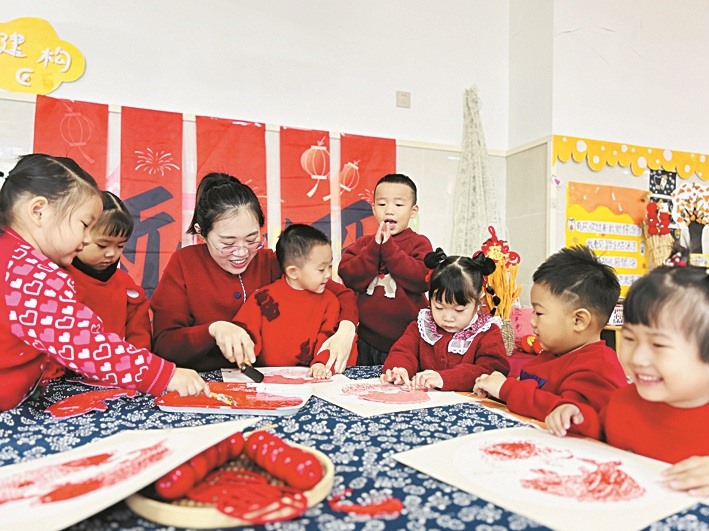近日,淄博市张店区齐润幼儿园开展新春版画创作活动。幼儿在教师的指导下拓印红色版画,沉浸式体验传统技艺,用童趣创作传递新年的祝福。(刘飞 甘凯丽)