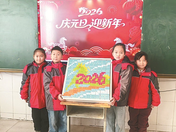 近日,临朐县辛寨街道卧龙小学魔方社团的少先队员们用100个色彩斑斓的魔方,精心拼出马与“2026”的创意图案,以独特的方式喜迎新年,尽显少年活力与创新精神。(马利 赵娜)