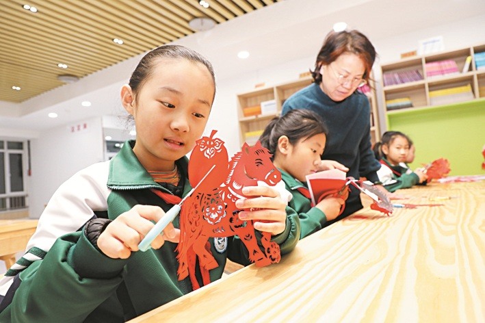 近日,在博兴县第四小学,学生在创作以生肖马为主题的传统剪纸作品。(陈彬)