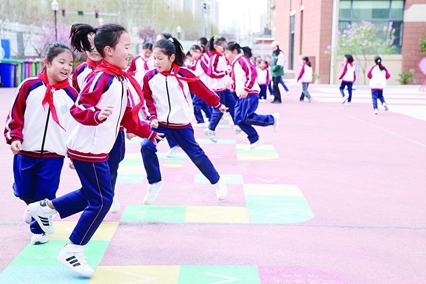 课间,天宁小学的学生在玩跳格子游戏