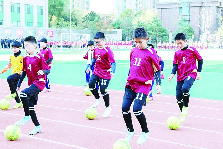 天宁小学足球队的学生进行足球技能展示
