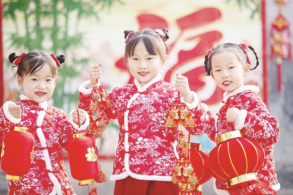 春节到了,在高青县常家镇的一处乡村院子里,3个孩子穿新衣、迎新春,乐享童年好时光。(张维堂 摄影报道)