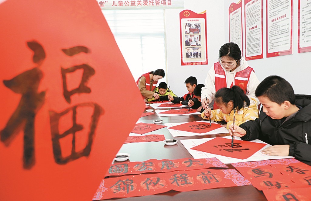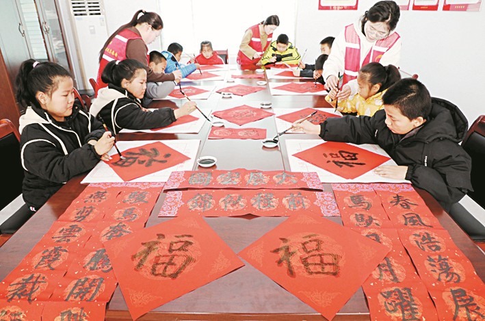近日,在博兴县乔庄镇梁楼村新时代文明实践站公益托管班,大学生志愿者在指导农村儿童练习书法,书写春联和