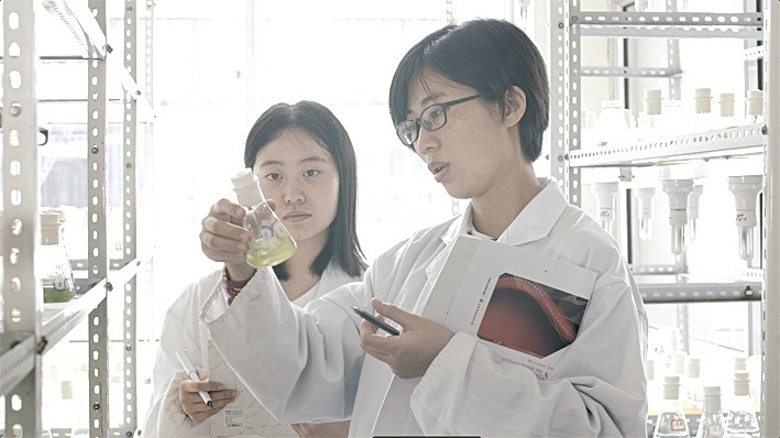 “科技副总”赵璐(右)在微藻减排与生物质利用新技术研发中心开展微藻研究
