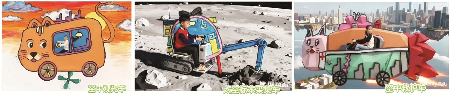 这次活动中,滨城区第四小学的科技创意作品尤为引人注目。学校将“我是汽车设计师”课程与AI创作有机整合。课堂上,一场关于未来汽车的头脑风暴正在上演。“你想设计一款什么样的车呢?”教师薛丽丽的提问,为学生开启了想象的闸门。“我想造一辆山地救援车,当山区的小朋友生病时,很快就能得到救治。”“我要设计一款能折叠的汽车,这样停车难问题就能迎刃而解。”在教师的引导下,学生梳理创作思路,从需求出发,将天马行空的想象落于理性的框架。循着自己的构思,学生大胆落笔,精心勾勒。独特的线条在纸上蜿蜒,别致的配色让画面鲜活——一个个造型新颖、功能丰富的汽车设计,从梦想驶入现实。而故事远未结束。借助电脑或手机端的AI生图、动画合成技术,学生将自己的原创美术作品导入各类AI软件进行二次创作。从故事编写到基本形观察,从角色设计到冷暖色小稿练习,从指令调整到音乐合成……一名学生回顾自己的创作历程时,眼中闪烁着兴奋的光芒,感慨道:“AI创作太有意思了,它把我的作品变得更加新奇独特!”