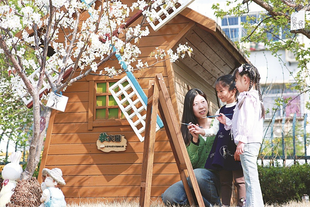 近日,东营市东营区实验幼儿园开展了春日写生活动。在教师指导下,幼儿用画笔捕捉春日生机,将满园春色定格在画纸上。图为教师正在带领幼儿写生。