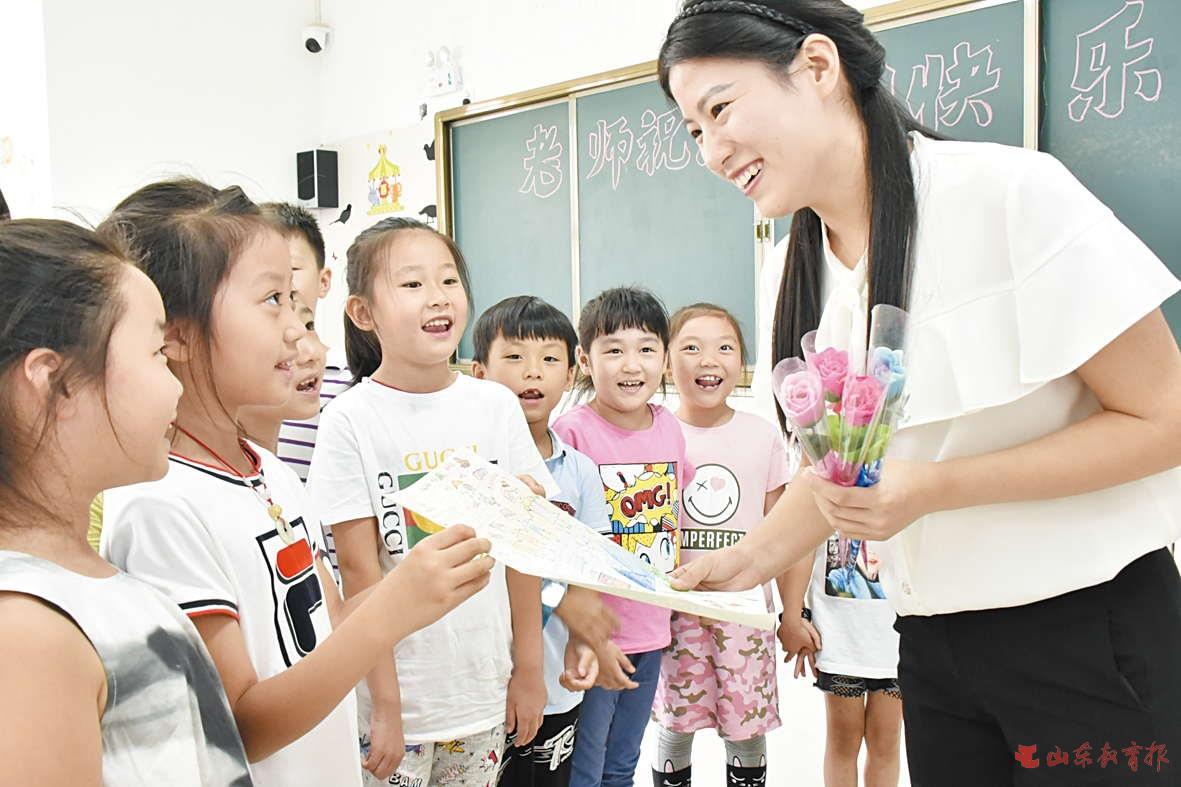 在第34个教师节到来之际,枣庄市广大中小学生用多种方式表达对老师的感谢和祝福。图为枣庄市实验小学二年级学生将自己亲手制作的塑料花、手抄报等送给老师。