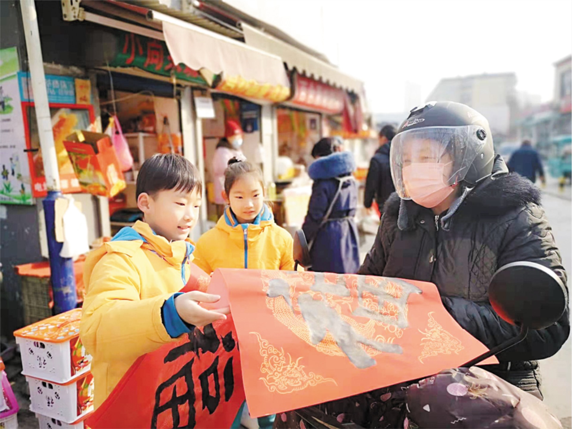春节将至,淄博市张店区和平小学党支部将“双报到”活动与年俗相结合,开展了“迎春送福,情暖社区”主题活动。(宋玉杰/摄)