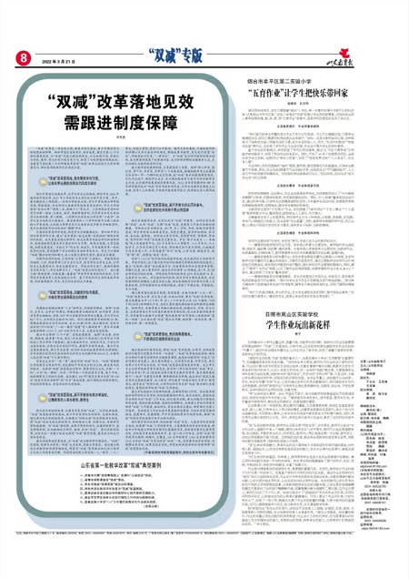 如何解决中小学作业量过多、质量不高、功能异化的问题?持续优化作业实践需要实现哪些转向?“双减”工作落地后,日照市岚山区实验学校牵住减轻学生作业负担的“牛鼻子”,通过科学合理地布置作业,让作业玩出了新花样,收到了减量不减质的效果,受到学生们的欢迎。