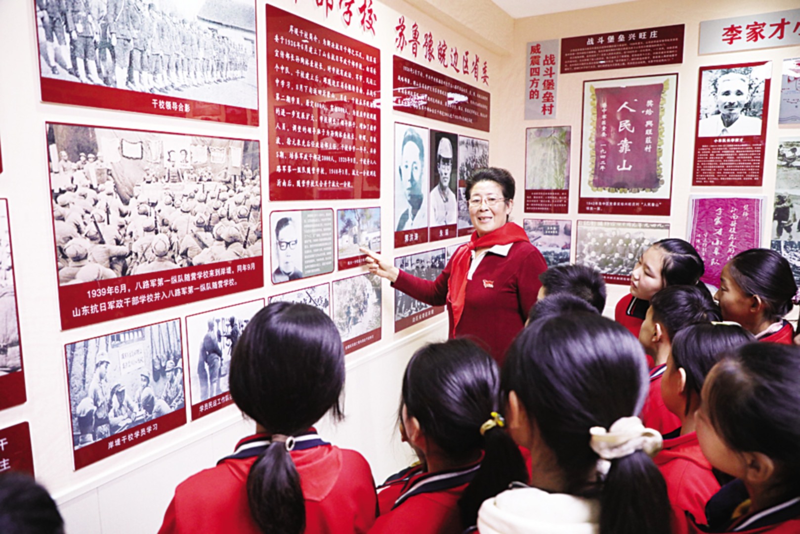 近期,沂南县岸堤镇中心小学创新学生思想道德建设,建成德育馆,成立拥军社团和小讲解员社团,邀请当地老英雄、老党员和“红嫂”到校开设“德育讲堂”,引导学生从小厚植爱党爱国情怀,让红色基因代代相传。图①为“兵妈妈”李光芹教学生学做拥军鞋垫。图②为李光芹给学生讲述沂蒙人民抗日支前的故事。(杜昱葆 张评 摄影报道)
