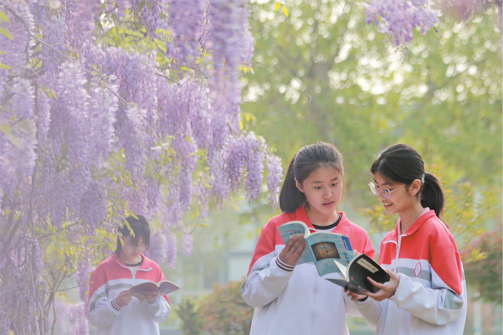 近日,高密市各中小学、幼儿园举办了丰富多彩的读书活动。图为学生在高密四中文慧学校校园里读书。