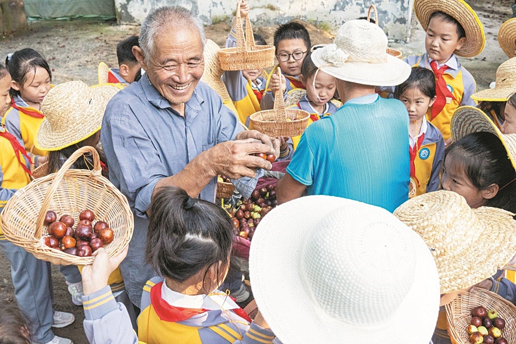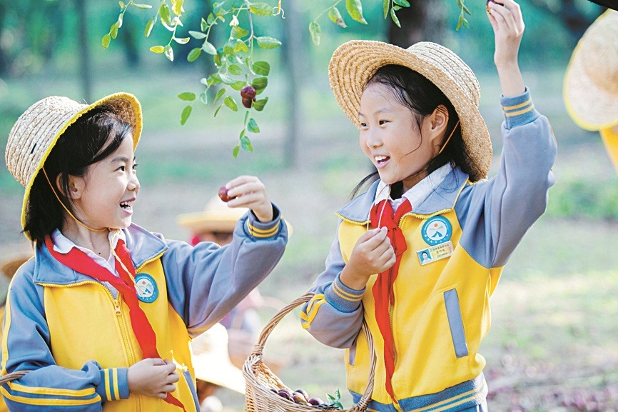 秋分时节,高青县实验小学学生走进古枣园开展劳动实践活动。他们在高大的枣树下打枣、拾枣、品尝鲜枣,聆听农民伯伯讲革命故事。80多年前,这些枣树“弯腰结蜜果,挺直作刀枪”,是游击队战斗屏障,为革命胜利立下汗马功劳。一堂校外思政课让学生收获了劳动体验与品德洗礼。图①为学生在古枣园里分享收获的大枣。图②为两名学生在古枣园里摘枣。
