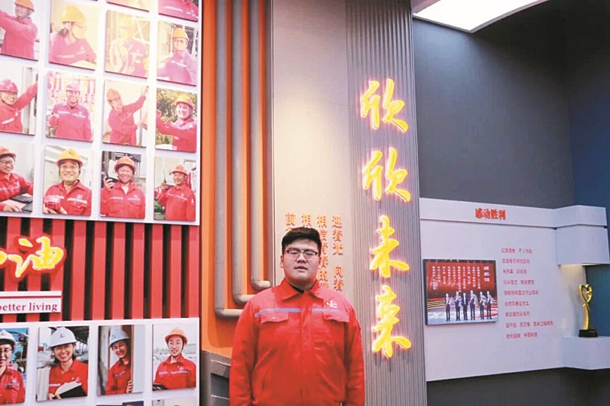毕业生高子凡在中石化胜利油田胜利石化总厂“大国工匠光荣榜”前