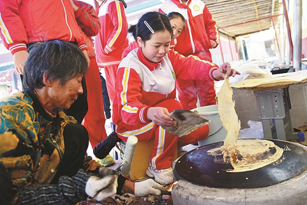 近日,沂源县第五实验小学开展“四季课程”冬季主题活动,邀请民间艺人现场展示山东非遗煎饼制作技艺。学生围在鏊子旁,观察面糊摊制、薄饼揭起的每个细节,还亲自上手体验,在热气与香气中感受传统美食文化的魅力。(马福燕)