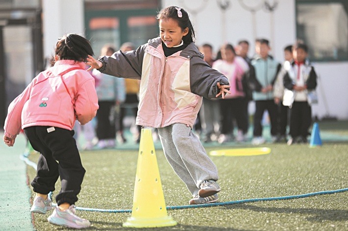 近日,在东营市东营区黄河路街道中心幼儿园操场上,各年龄段幼儿在晨间户外体能循环自主探索活动中尽情享受运动的快乐。图为幼儿在玩“猫捉老鼠”游戏。(缪宏伟)