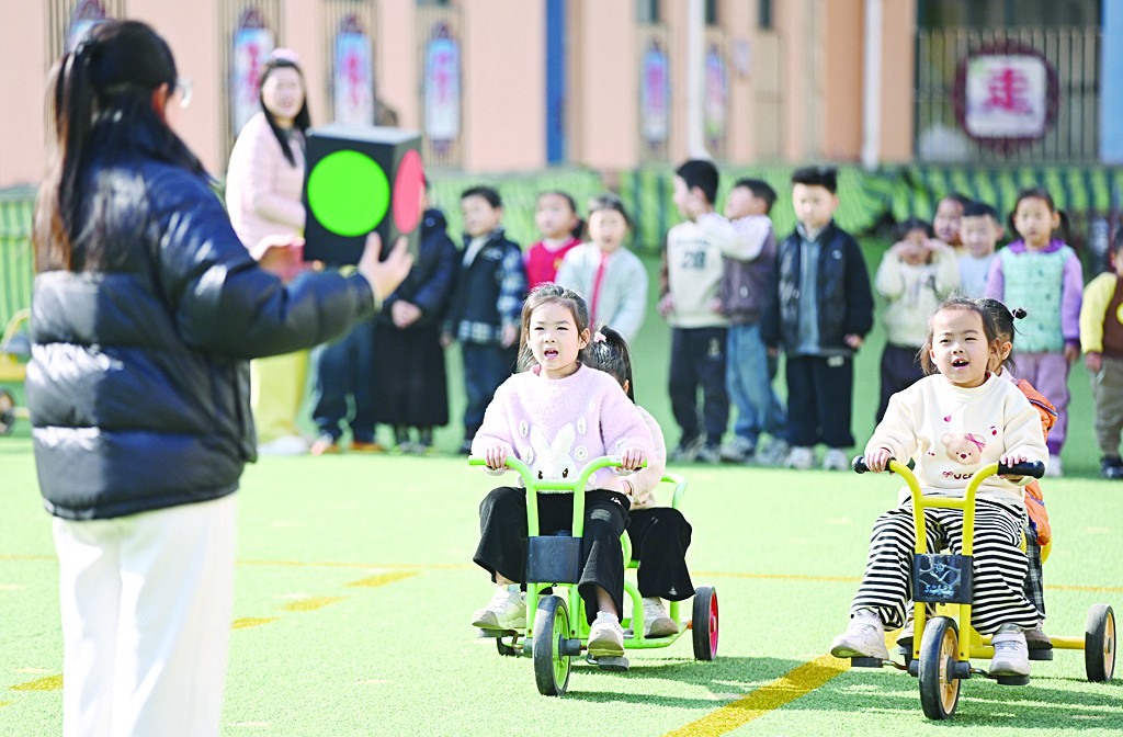 12月1日,滕州市西岗镇中心幼儿园教师用废旧纸盒制作交通标识牌,和幼儿一起玩“安全出行”趣味游戏,以增强其安全文明出行意识。