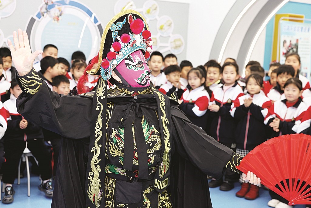 1月29日,枣庄市市中区红旗小学开展了“非遗进校园、迎新春”主题活动。该校邀请民间艺人走进校园,传授非遗知识、展示非遗技艺,让学生沉浸式感受中华优秀传统文化的魅力。图为民间艺人为学生表演“变脸”。