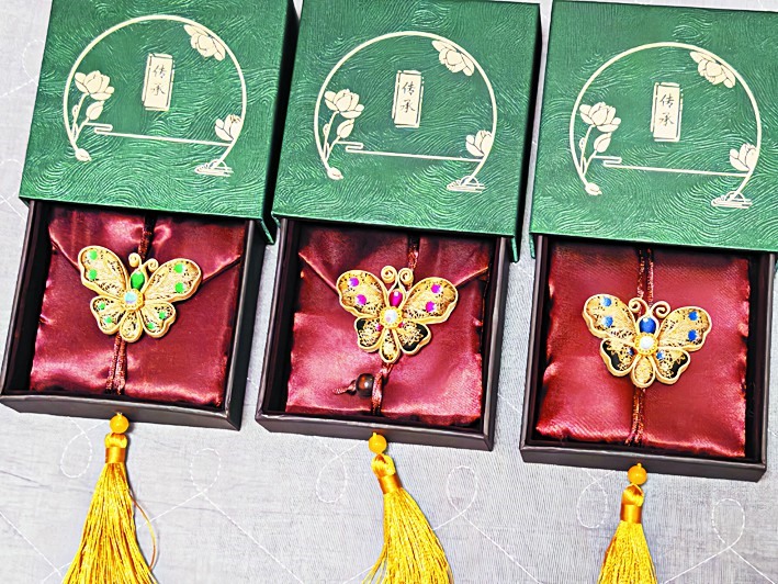 传承之路,授艺更需育人。盘扣中复杂的蝴蝶造型,成为学生学习道路上的“拦路虎”,不少人因形态不稳、比例失衡反复拆线而沮丧。徐卓并不急于示范,而是坐在学生身旁耐心拆解工序,从扣条折法、盘绕力度到针脚疏密,逐一讲清原理、示范要点,陪着学生一针一线打磨修正。当一枚枚轮廓舒展、层次分明的蝴蝶盘扣在指尖“展翅”,教室里的笑声与学生心中的成就感一同绽放。学生从中不仅习得了技艺,而且体会到传统工艺“慢下来、静下心”的价值,领悟了坚持与专注的力量。