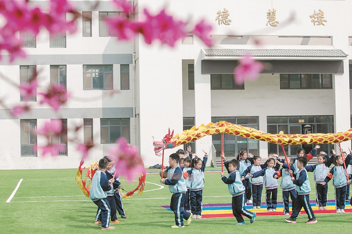 日,高青县田镇学区中心小学学生利用大课间开展了丰富多彩的活动,乐享春日校园好时光。图为学生正在练习舞龙。