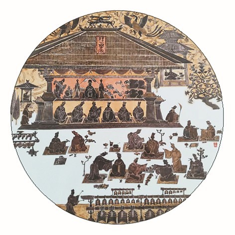 两件作品的构图逻辑,借鉴画像石“分栏布势”的手法,将《滥竽充数》拆分为“宣王听乐”“吹竽场景”“乐舞瑞兽”三层;画面上层是齐宣王的宫阙,象征王权与礼乐秩序;中层是吹竽乐师阵列,南郭先生混于其中,在群体中形成视觉“破绽”,让观众在细节中读懂故事的讽刺意味;下层则以对舞的凤鸟与乐人呼应 “乐以载道” 的主题,暗喻“真才实学方能长久”的寓言内核。《百家争鸣》则以“稷下学宫”为中心,分层排布讲学、论辩、礼乐场景,既保留了汉代画像石的秩序感,又符合陶瓷盘器的圆形审美。诸子百家分列而坐,或执卷论道,或拱手辩论,或抚琴明志,将战国时期“不治而议论”的学术氛围具象化;下方的编钟、鼎器,则呼应“礼崩乐坏后思想觉醒”的时代背景。