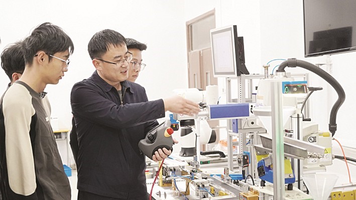 王宏甲(中)指导学生制作茶叶包装流水线设备